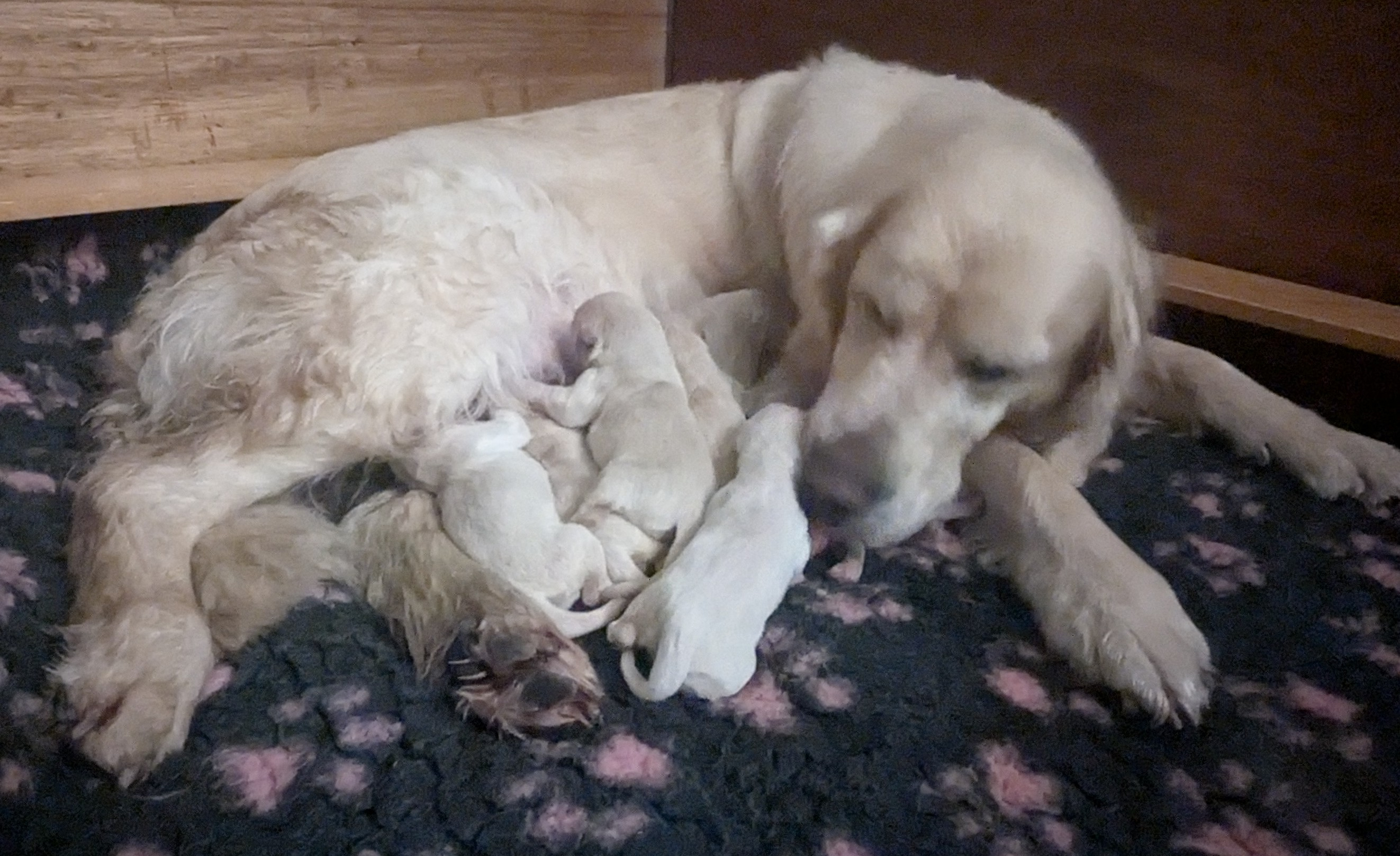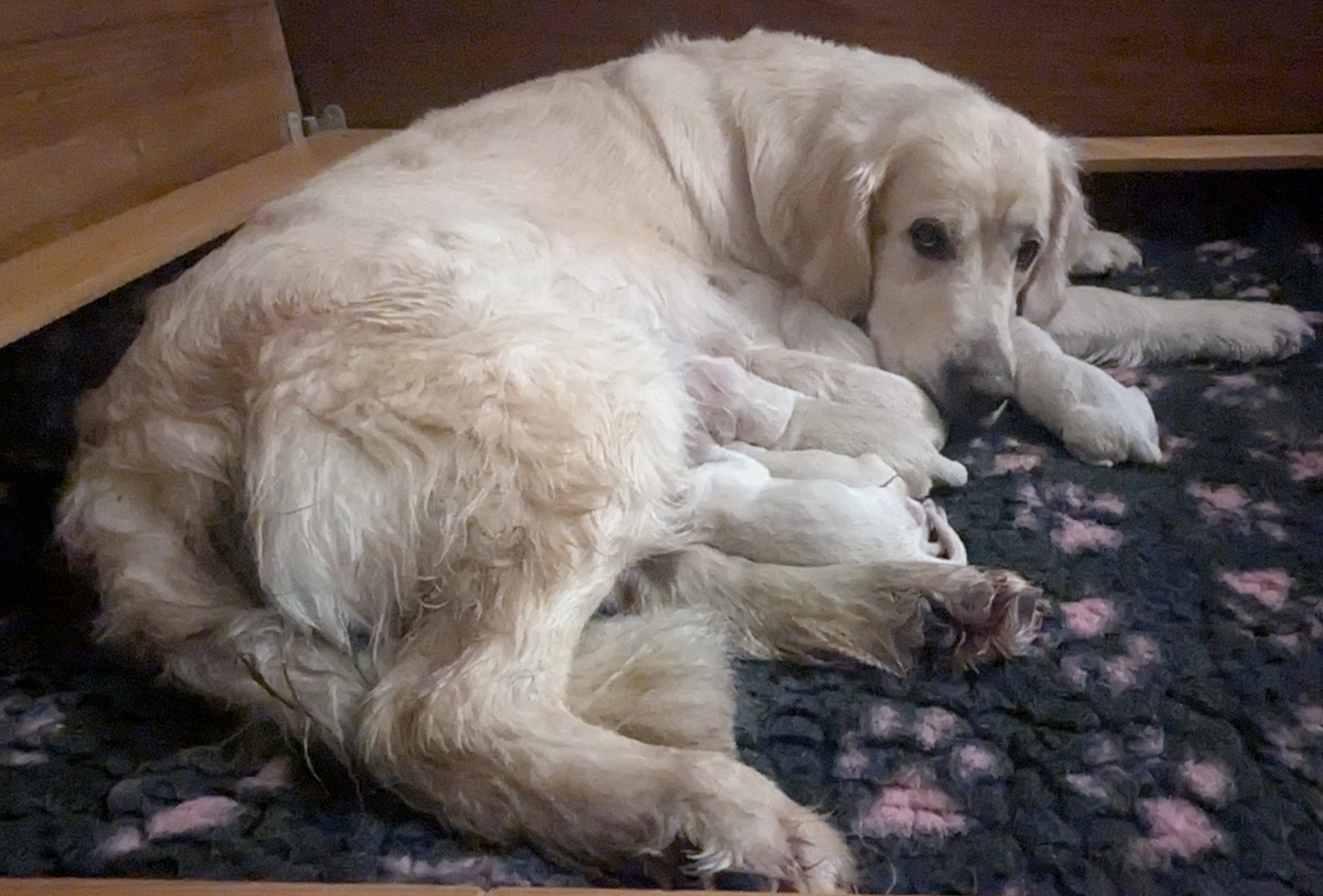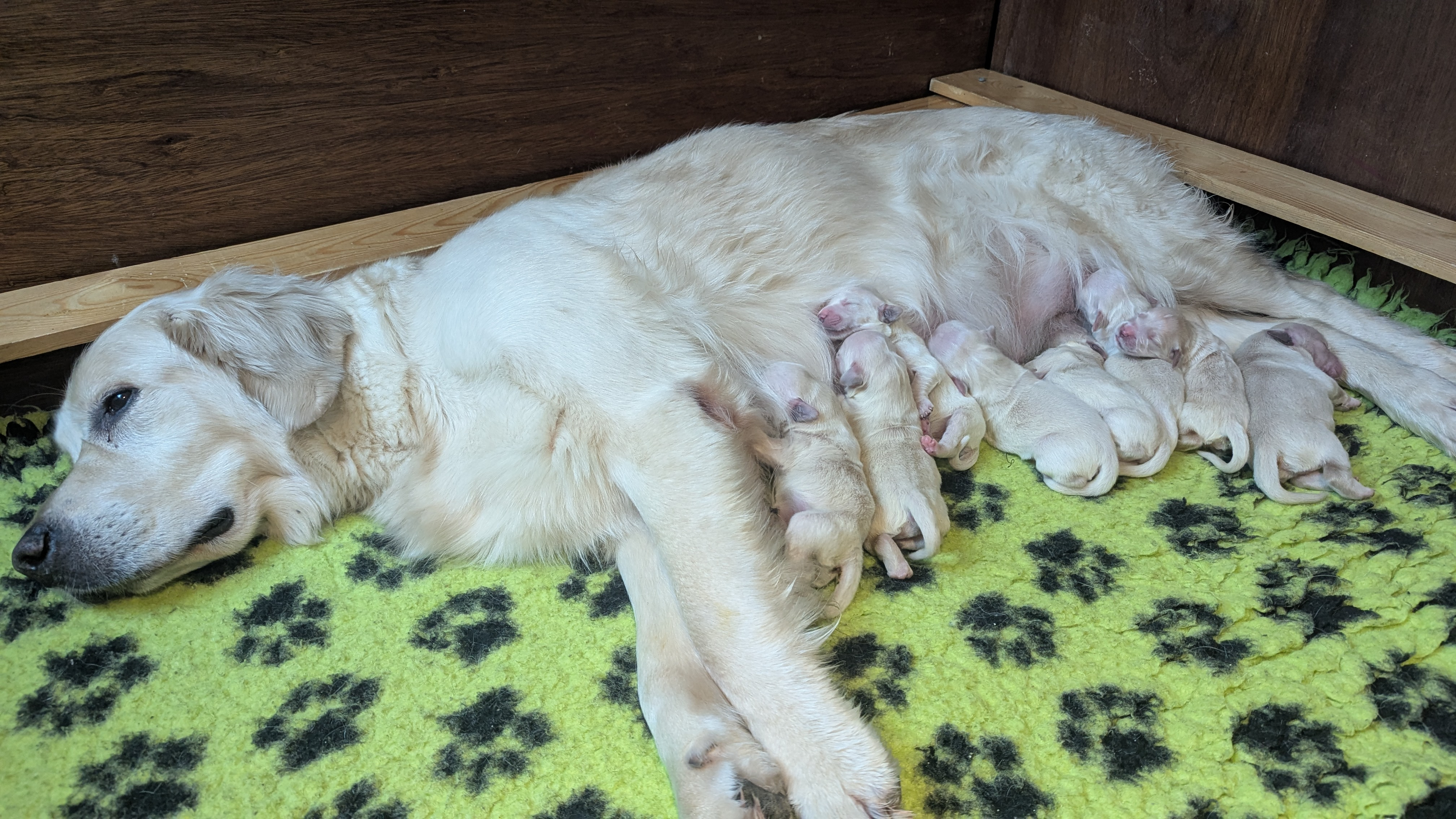Da har goldenvalpene kommet Publisert 02/03/2026 Lørdag kveld, 28.februar, fødte Delta 9 små valper. Dessverre var den ene valpen dødfødt, men hun har 8 livlige, nydelige valper å kose seg med. Vi fikk 6 tisper og 2 hanner